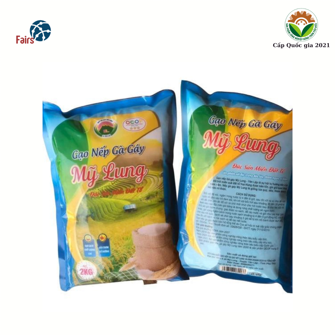 Sản phẩm gạo nếp Gà gáy Mỹ Lung đạt sản phẩm OCOP 3 sao năm 2020 và được nâng hạng 4 sao theo Quyết định số 3050/QĐ-UBND ngày 18/11/2022 của UBND tỉnh Phú Thọ.