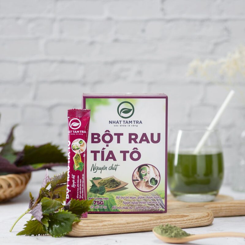 Tía tô là loại rau thơm khá phổ biến, có tác dụng chữa rất nhiều bệnh. Theo y học cổ truyền, tía tô là vị thuốc được xếp vào loại kích thích ra mồ hôi, có tác dụng giãn mạch ngoài da, hạ sốt, trừ cảm mạo. Phụ nữ uống nước lá tía tô mỗi ngày sẽ cải thiện sắc tố da, tẩy tế bào chết.Từ đó xóa mờ nám, dưỡng trắng da cực kỳ nhanh chóng, giảm cân hiệu quả. Hiểu được những công dụng quý giá từ tía tô, chúng tôi đưa ra một sản phẩm an toàn và tiện dụng giúp mọi người dễ dàng sử dụng hơn đó là bột rau tía tô.