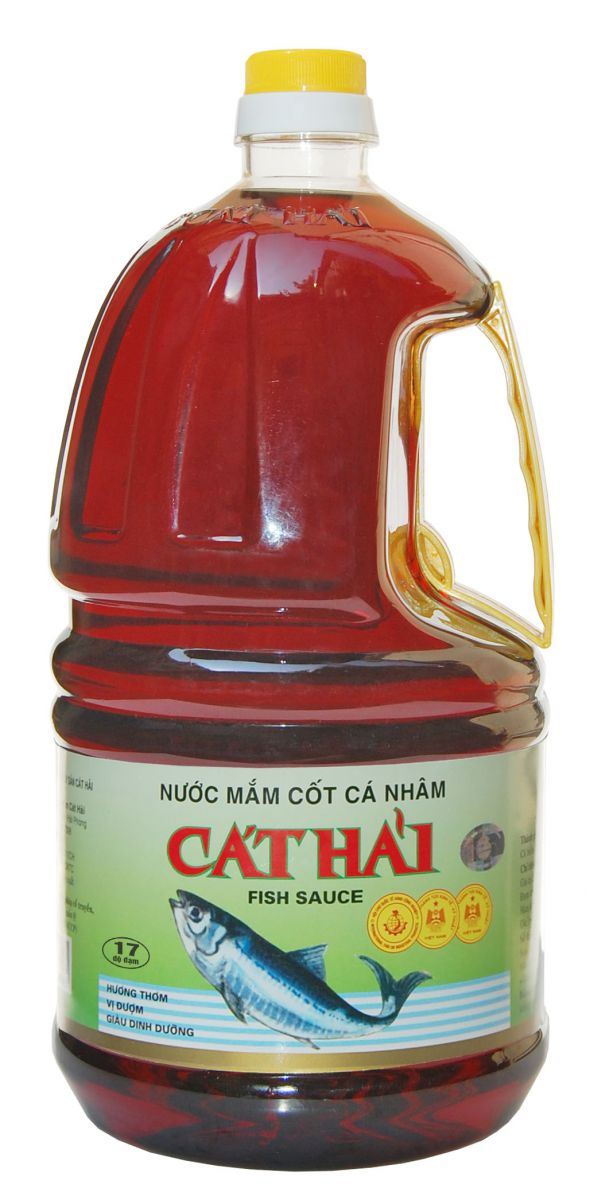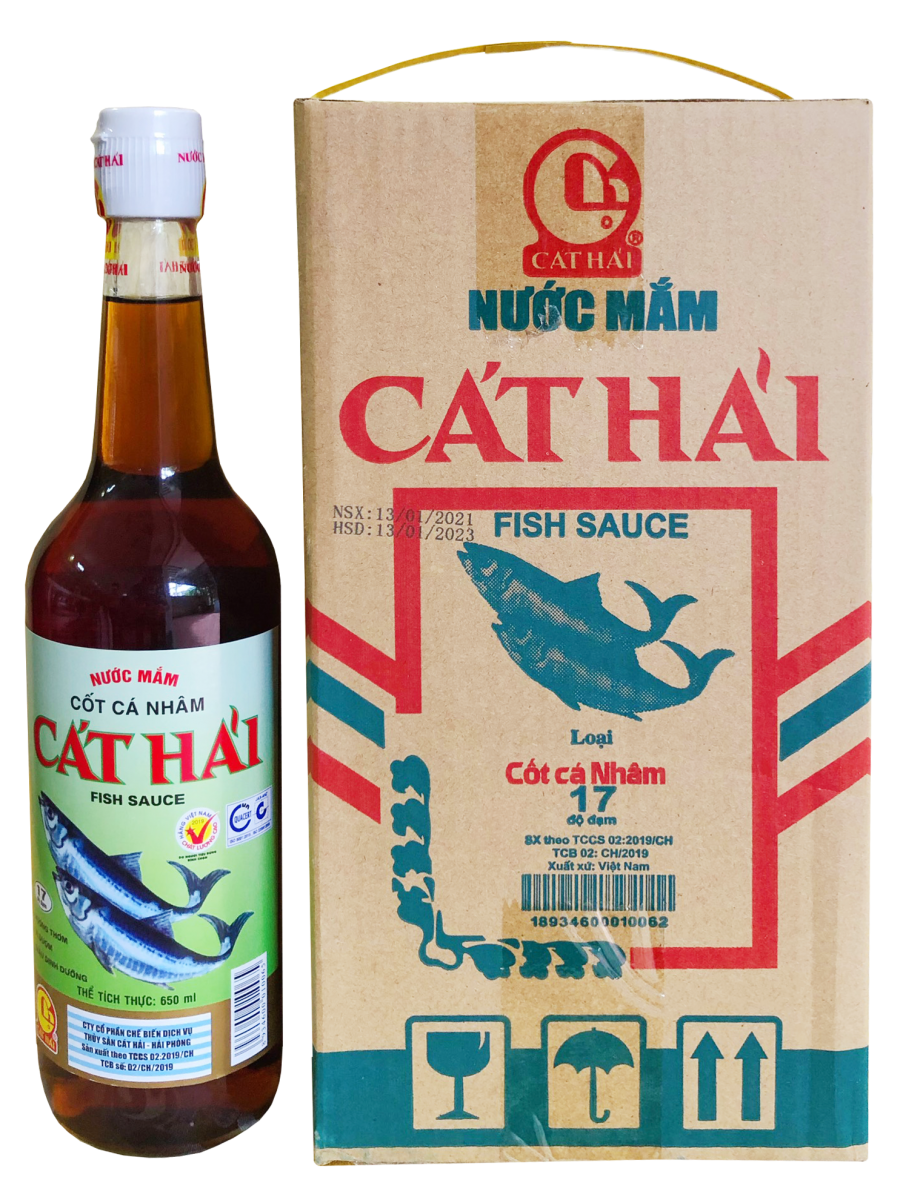 Nước Mắm Cát Hải Cốt Cá Nhâm Can 2 lít Thành phần: Cá biển (Cá Nhâm 60%) Muối ăn (NaCl) Chỉ tiêu chất lượng: – Giá trị dinh dưỡng: ≥ 425 kCal – Hàm lượng Nitơ tổng số ( Độ đạm) ≥ 17g/lít – Hàm lượng Axit amin: ≥ 40% so với hàm lượng Nitơ tổng số HDSD: Sản phẩm sử dụng trực tiếp hay thêm gia vị làm nước chấm khi ăn hoặc làm gia vị chế biến món ăn khác BẢO QUẢN: Ở nhiệt độ thường, để nơi khô ráo, thoáng mát, sạch sẽ, tránh ánh nắng trực tiếp Nước mắm Cát Hải “Nhãn Hiệu độc quyền” của Công ty cổ phần chế biến dịch vụ thủy sản Cát Hải – Hải phòng; được chế biến từ cá biển với quy trình công nghệ cổ truyền “ Phân giải Protein thành Axít amin bằng phương pháp chế biến lên hương tự nhiên” không dùng bất cứ một loại chất xúc tác nào, với đặc trưng riêng có. Nhắc đến nước mắm dân ta có câu: “Dưa La, húng Láng, nem Báng, tương Bần, nước mắm Vạn Vân, cá rô Đầm Sét.” Từng nổi danh với thương hiệu Vạn Vân đầu thế kỷ 20, nghề làm nước mắm ở Cát Hải (huyện Cát Hải, TP.Hải Phòng) nay vẫn được lưu giữ bởi người dân. Nước mắm truyền thống Cát Hải thường có vị mặn hơn, mùi nặng hơn, nên cũng… “mắm” hơn nhiều loại nước mắm khác trên thị trường. Lưu ý: Nước mắm bị đóng cặn hay chuyển màu khi tiếp xúc với không khí là đã hỏng? **Việc nước mắm đổi màu khi tiếp xúc với không khí cũng là việc bình thường do axit amin trong nước mắm bị oxi hóa. Đổi màu chứng tỏ đây là nước mắm nguyên chất, không có chất tạo màu và chất bảo quản. **Với tỉ lệ muối cao nên khi có sự thay đổi về nhiệt độ, nhất là vào mùa đông hay nơi để nước mắm có nhiệt độ thấp hoặc để chai 1 chỗ lâu ngày sẽ bị lắng cặn muối. Chỉ cần lắc nhẹ là số muối này sẽ bị hòa tan.