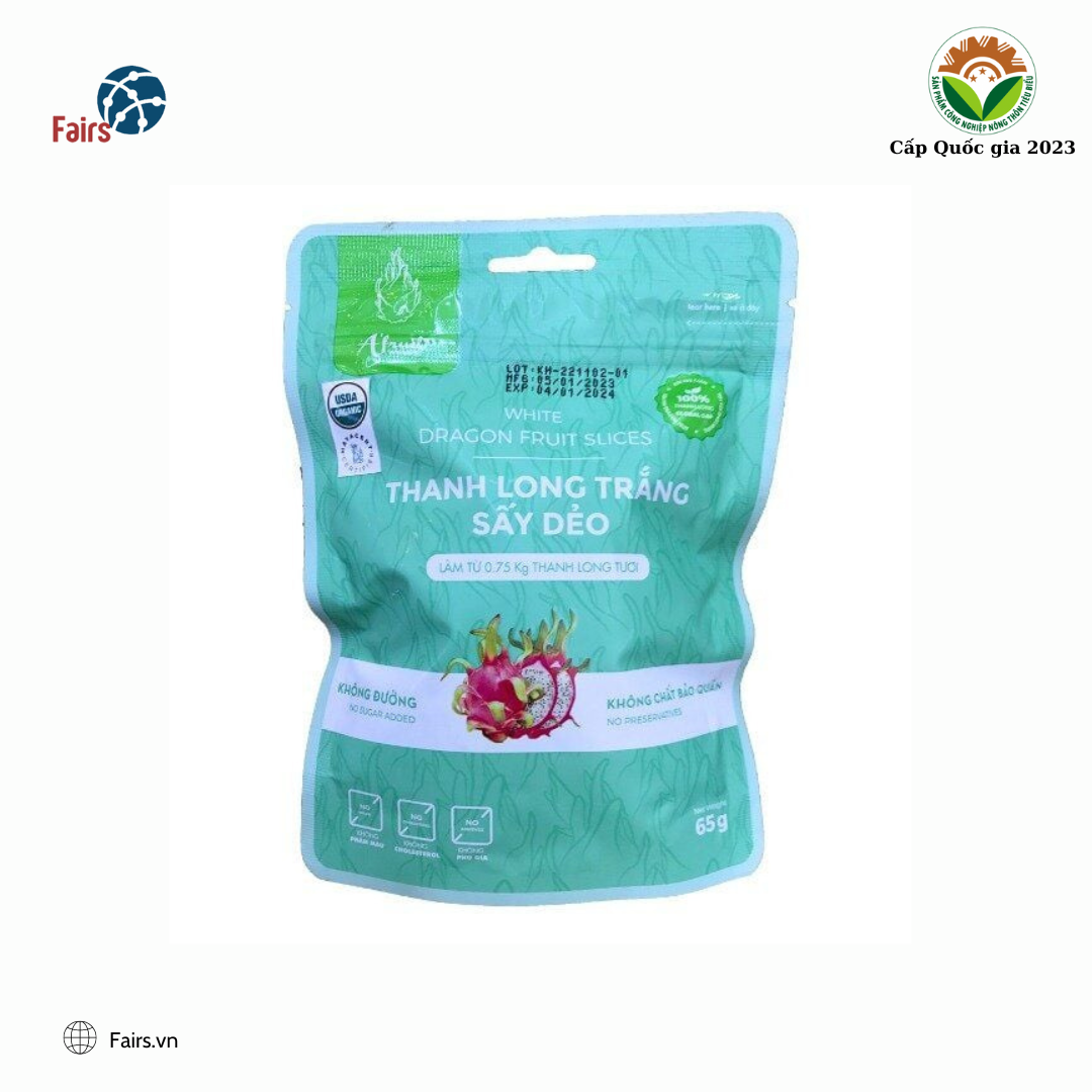 Thanh long trắng được lựa chọn những quả tươi nhất, ngon nhất, sấy dẻo – sử dụng nhiệt độ cao (50 – 70 độ C) để làm mất đi một phần hơi nước của sản phẩm rồi đem đi làm mát. Thanh long trắng sấy dẻo A’Fruit gói 65g chất lượng, ngọt thanh, ăn vặt vui miệng từ trái cây sấy A’Fruit