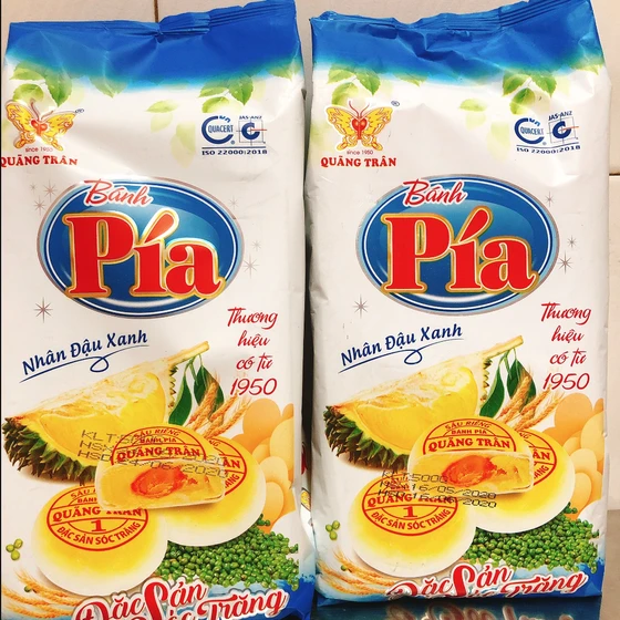 Bánh pía nhân đậu xanh Quãng Trân có vị ngọt nhẹ của đậu xanh và vị bùi của sầu riêng và đậm đà của trứng, lớp vỏ bánh mềm dẻo, mỏng manh nhưng đoàn kết ôm lấy nhân bánh thơm ngọt bên trong.