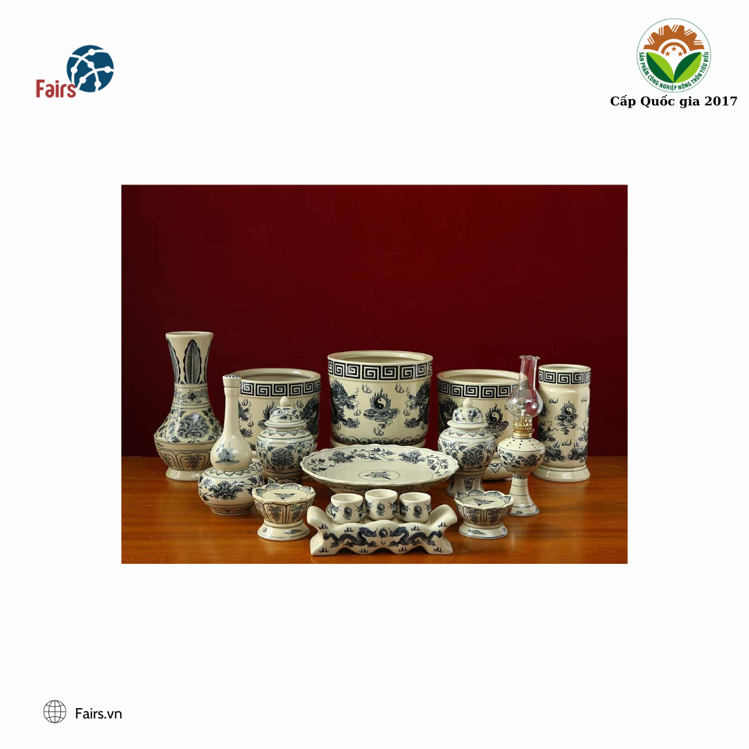 Bộ đồ thờ 15 sản phẩm bao gồm: bát hương, bộ đỉnh hạc, chĩnh thờ, lộc bình, nậm rượu, chén thờ, hạc nến, đèn dầu, đỉnh thờ, mâm bồng, ống hương, lư hương,bộ chén thờ, khay trầu cau,lọ hoa gốm, được chế tác và thiết kế vô cùng cẩn thận và tỉ mẩn từ các nghệ nhân. Từ khâu chọn đất, những viên đất được chọn lựa kĩ càng từ vùng đất Chí Linh, sau đó đưa về làng qua nhiều công đoạn nghiền, trộn, ủ, đúc khuôn mới mang đến được những sản phẩm gốm men rạn chỉ riêng gốm Chu Đậu mới có.