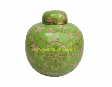 Hộp sứ nắp tròn phù dung xanh chạm đồng