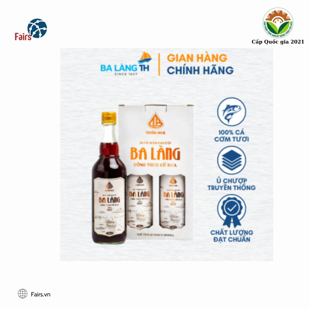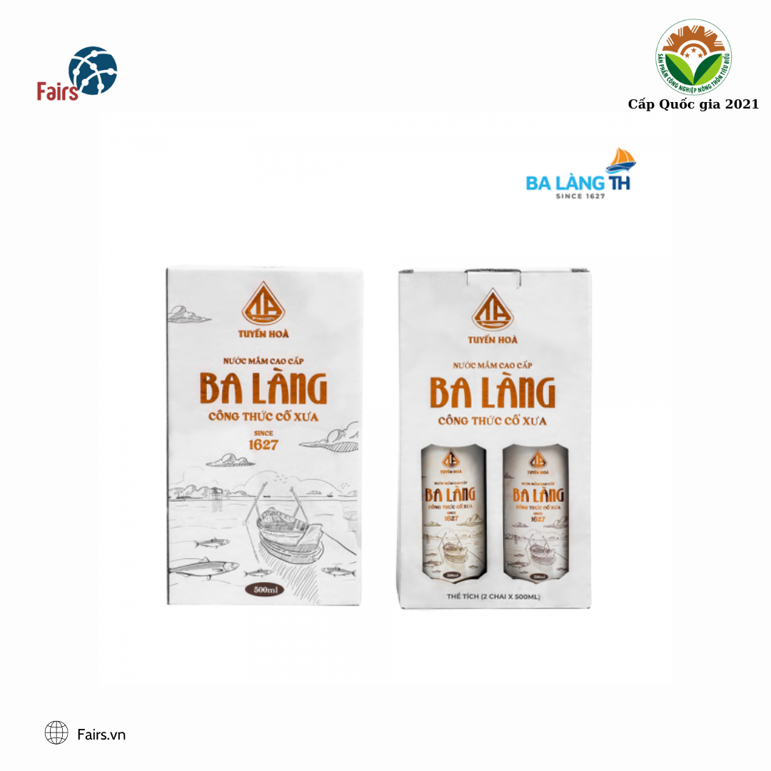 Bộ đôi quà biếu nước mắm cao đạm truyền thống Ba Làng 41N 500ml được chắt lọc từ nước cốt cá cơm tươi và muối biển ủ lâu năm theo phương pháp gia truyền – Đặc biệt đã qua công nghệ thanh trùng, giảm mặn tốt cho sức khoẻ.