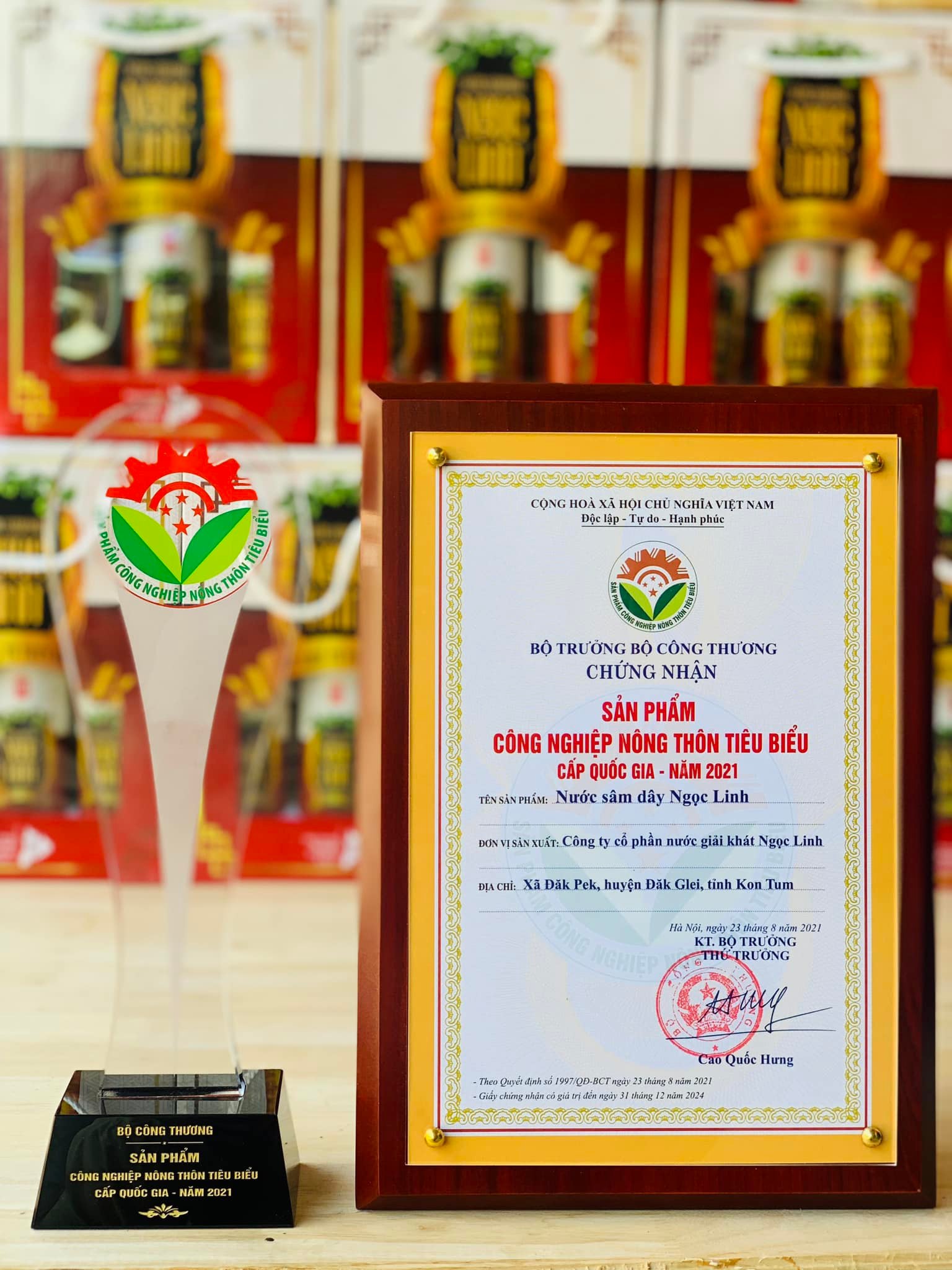 Sản phẩm “Nước sâm dây Ngọc Linh” của CTCP nước giải khát Ngọc Linh vinh dự là 1 trong 2 sản phẩm duy nhất của toàn thành phố Kon Tum được Bộ Công Thương cấp giấy chứng nhận “Sản phẩm công nghiệp nông thôn tiêu biểu cấp quốc gia” năm 2021. Vì tình hình dịch bệnh nên việc trao giấy chứng nhận không thể diễn ra trực tiếp tại Hà Nội mà được Sở công thương KonTum tổ chức trực tuyến.