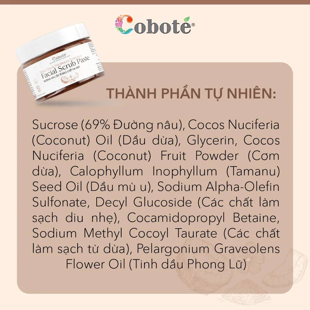 Bước cơ bản nhất trong chu trình chăm sóc da mặt đó chính là tẩy tế bào chết. Nắm bắt được nhu cầu đó, Coboté đã cho ra mắt dòng sản phẩm Tẩy tế bào chết da mặt – đường nâu | Facial Scrub Paste. Với những hạt đường nâu siêu mịn và cơm dừa sấy khô khi ti, sản phẩm sẽ nhẹ nhàng loại bỏ bụi bẩn, bã nhờn bên trong lỗ chân lông và các tế bào già cỗi trên bề mặt; giúp da thông thoáng, mềm mượt. Hơn thế nữa, sự kết hợp giữa dầu dừa – tinh hoa của vùng đất Bến Tre và dầu mù u – thành phần vượt trội trong kháng viêm và trẻ hóa da, sản phẩm sẽ đem lại hiệu ứng kép, vừa khắc phục những vấn đề về da, vừa nuôi dưỡng giúp làn da khỏe mạnh và tràn đầy sức sống.