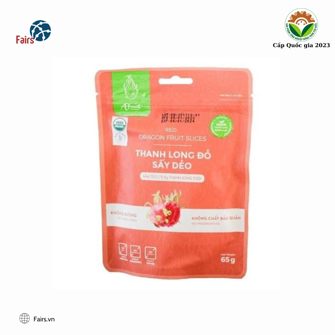 Thanh long đỏ được lựa chọn những quả tươi nhất, ngon nhất, sấy dẻo – sử dụng nhiệt độ cao (50 – 70 độ C) để làm mất đi một phần hơi nước của sản phẩm rồi đem đi làm mát. Thanh long đỏ sấy dẻo A’Fruit gói 65g chất lượng, ngọt thanh, ăn vặt vui miệng từ trái cây sấy A’Fruit