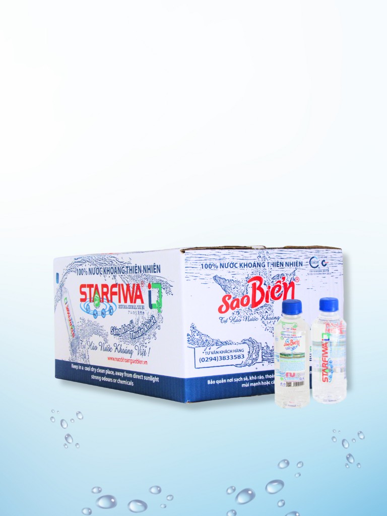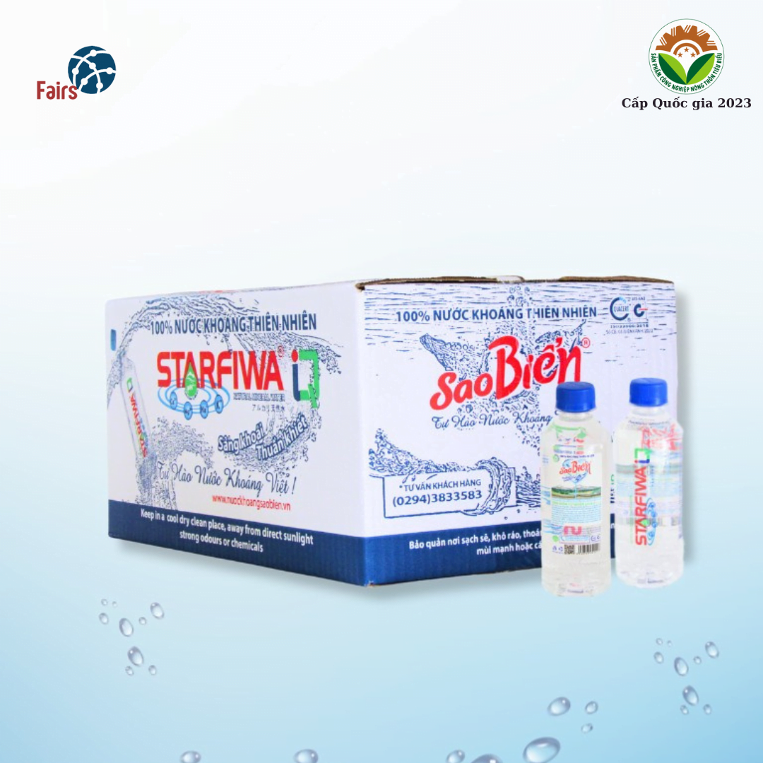 Nước khoáng thiên nhiên Sao Biển là sản phẩm của Công ty Cổ phẩn Thực Phẩm Biển Xanh được khai thác và sản xuất từ nguồn khoáng nóng Long Toàn rất sâu trong lòng đất, chảy qua nhiều địa hình và tầng địa chất giàu khoáng chất quý giá. Khai thác và xử lý bằng công nghệ tiên tiến, chất lượng sản phẩm được quản lý nghiêm ngặt theo tiêu chuẩn ISO 22000:2018. Nước khoáng Sao Biển – STARFIWA chứa hàm lượng khoáng nhẹ nên thích hợp sử dụng giải khát và góp phần bù khoáng hàng ngày cho cơ thể.