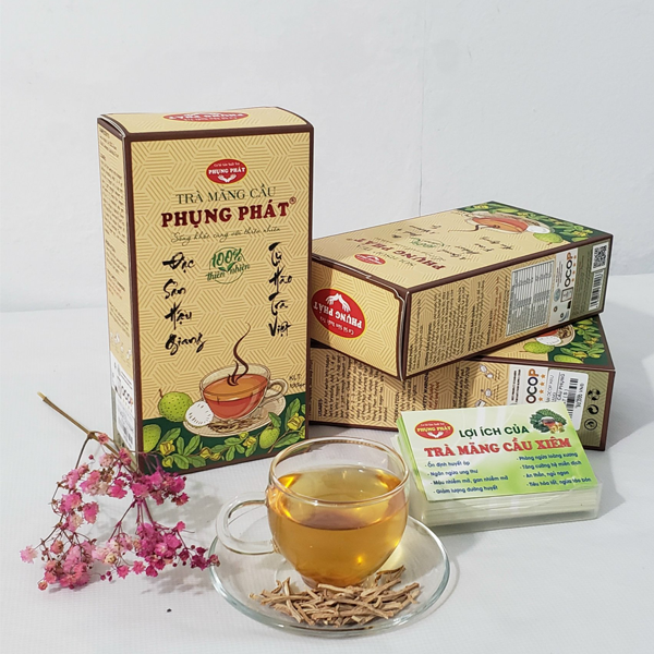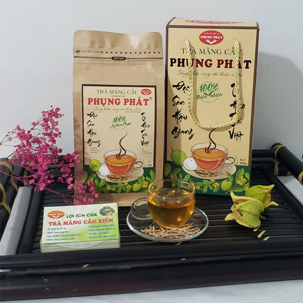 Trà mãng cầu Phụng Phát được làm từ 100% từ thịt quả mãng cầu xiêm già vừa đủ, được cắt sợi, phơi nắng cho ráo và được xao vàng ươm với nhiệt độ vừa đủ để bảo đảm giữ được hương vị dịu nhẹ của mãu cầu cũng như các dưỡng chất . Bên cạnh hương vị thơm ngon dịu nhẹ giúp người dùng thư giản sau những giờ làm việc mệt mỏi, trà mãng cầu Phụng Phát còn giúp người dùng bảo vệ sức khoẻ của mình