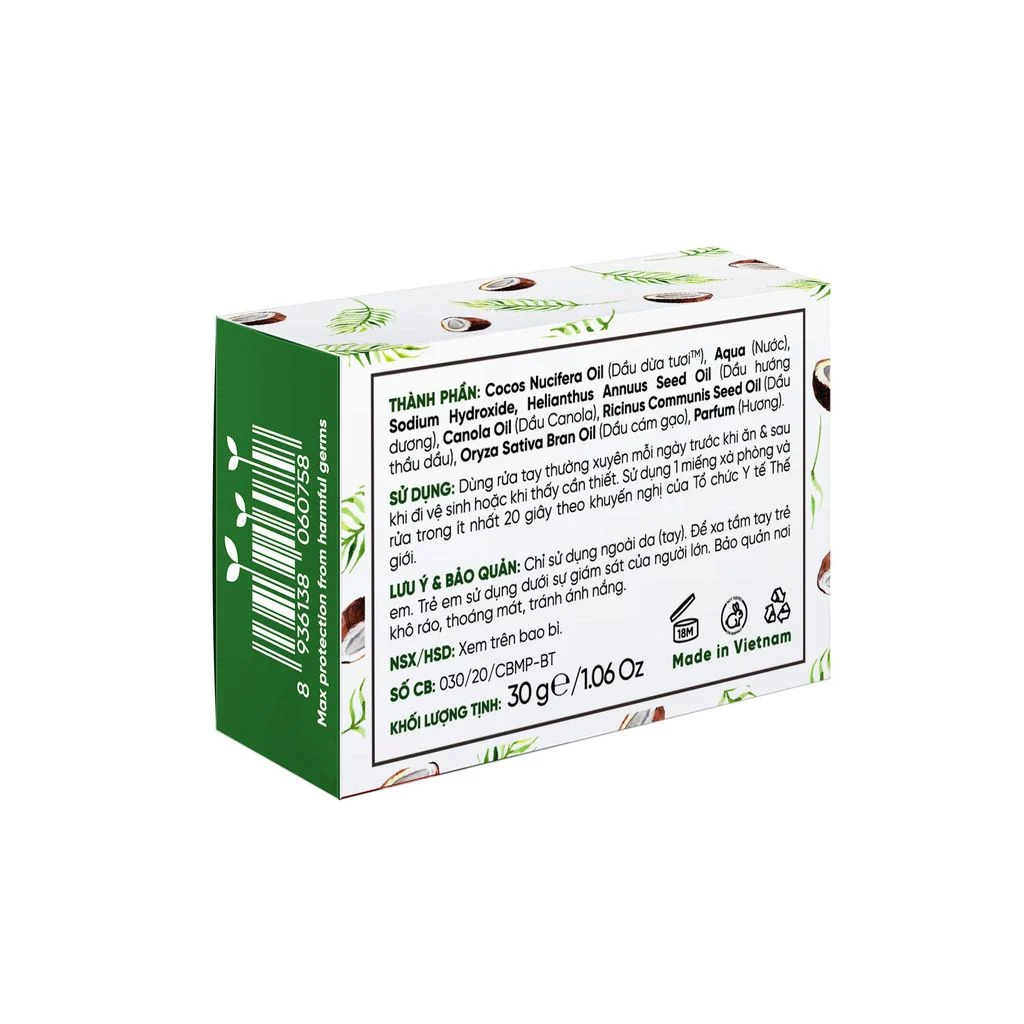 🌴 Thành phần xà phòng hóa chủ yếu từ dầu dừa tươi có đến 48% thành phần acid béo là lauric acid đã được chứng minh có tác dụng kháng viêm, kháng khuẩn hiệu quả, cũng như có tiềm năng trong việc tiêu diệt virus.