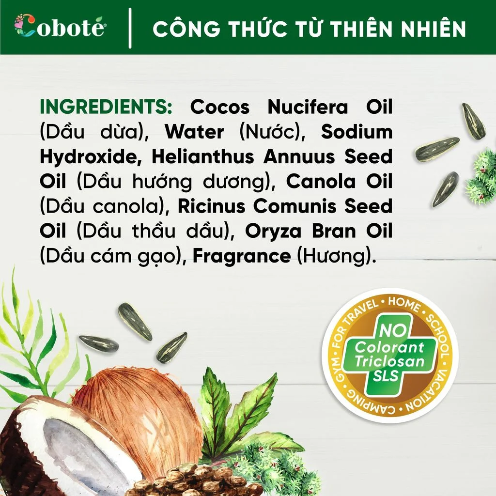Coboté Coco Miracle Soap-to-go (xà phòng lá) được sản xuất thủ công theo quy trình xà phòng nguội truyền thống. Xà phòng rửa tay làm từ dầu dừa có chứa lauric acid, sau phản ứng xà phòng hóa tạo thành sodium laureate, tạo rất nhiều bọt khi rửa và có khả năng làm sạch mạnh mẽ.